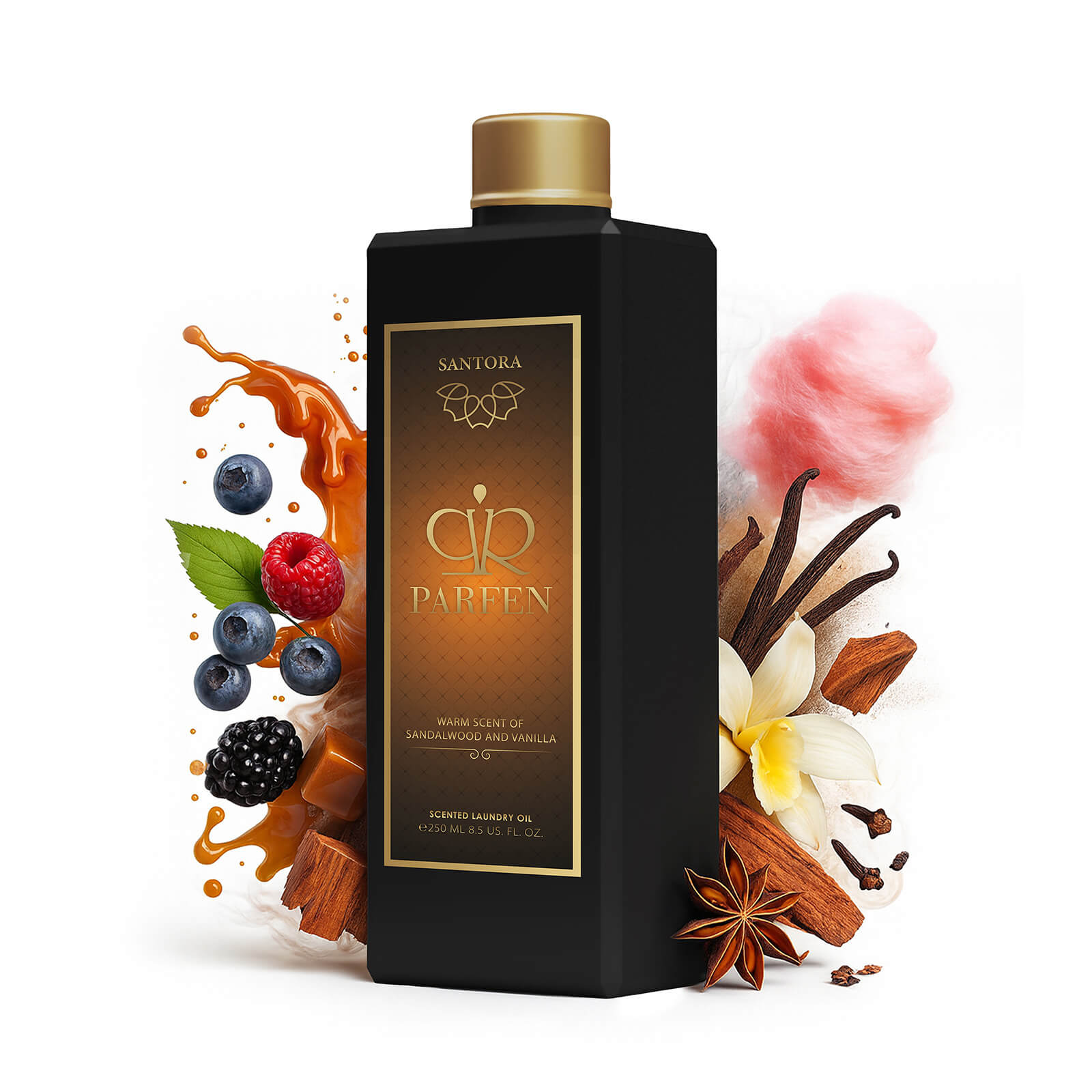 SANTORA je podmanivá vůně na praní. Po vyprání zanechává na textiliích sladkou gurmánskou vůni, zjemněnou balzamickým aromatem santalového dřeva. Vaše oblečení i ložní prádlo obalí do hřejivých tónů. Ještě dlouho po vyprání z ní ucítíte nasládlé a delikátní orientální aroma.