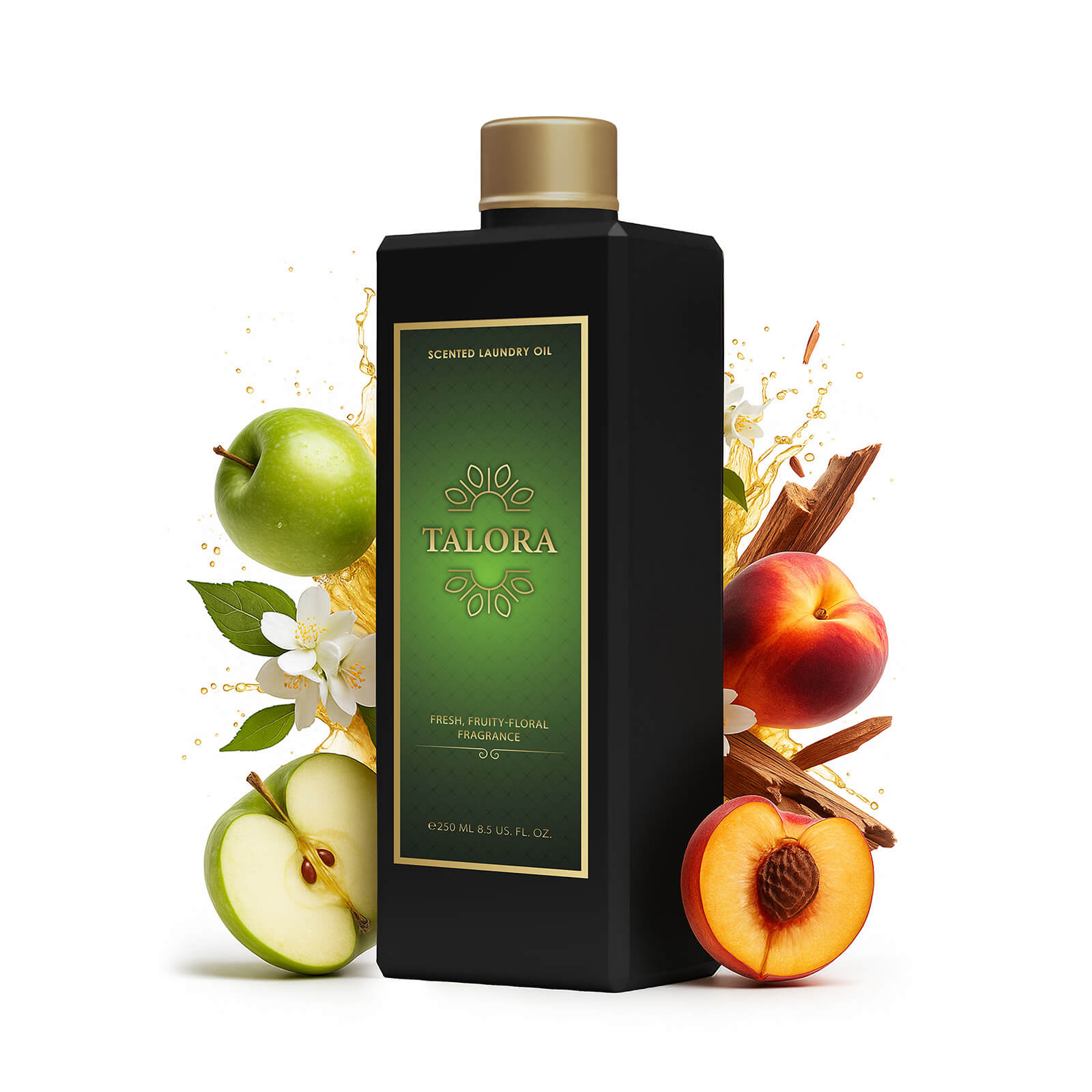 Hledáte alternativu ke klasické aviváži? Pokud toužíte po svěžím prádle s nádechem šťavnatého ovoce, parfém do praní TALORA je pro vás ten pravý. Obsahuje šťavnaté tóny broskve a jablka, které v kombinaci s ostatními ingrediencemi vytvářejí dojem procházky rozkvetlým sadem plným pozitivní energie.